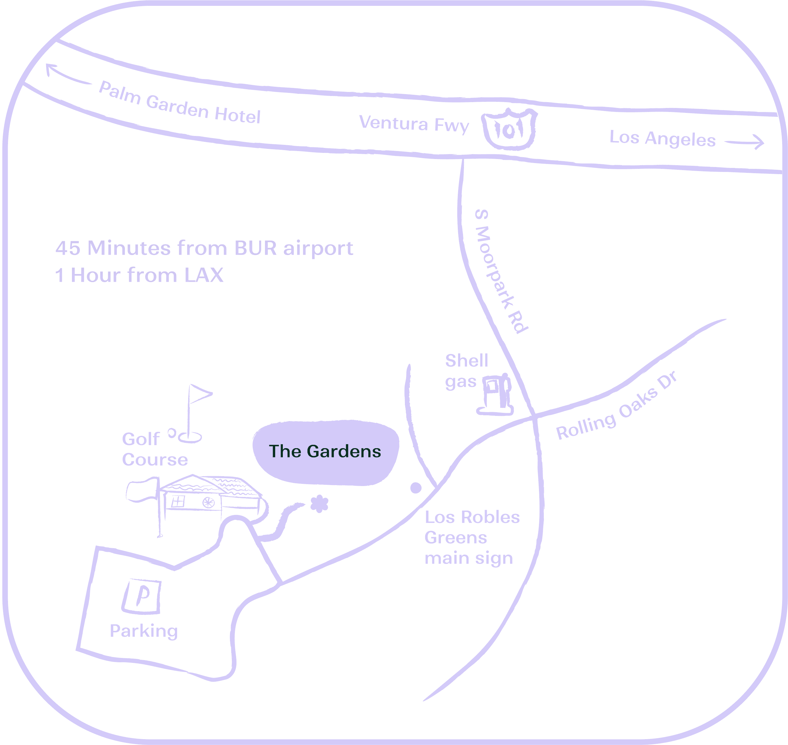 The Gardens at Los Robles is located in Los Robles Greens golf course. It is in the city of Thousand Oaks, California — a 45 minute drive from BUR airport and about 1 hour drive from LAX airport. If staying at a hotel nearby, we recommend taking an Uber or Lyft. Otherwise, onsite self-parking is available.